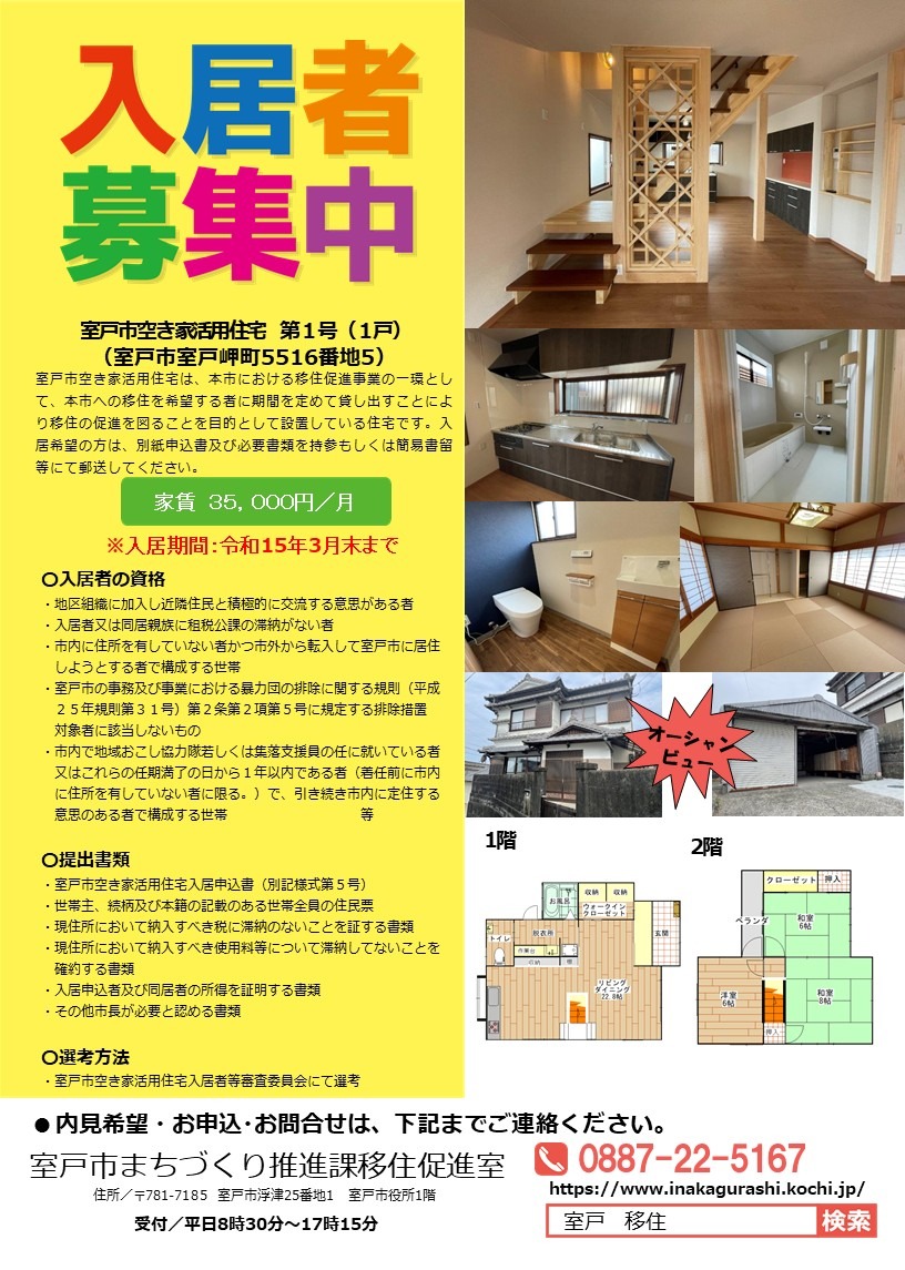 室戸市空き家活用住宅について、下記のとおり入居者を募集します。入居希望者は室戸市まちづくり推進課移住促進室へ申込書及び必要書類を持参もしくは郵送により申し込みをしてください。